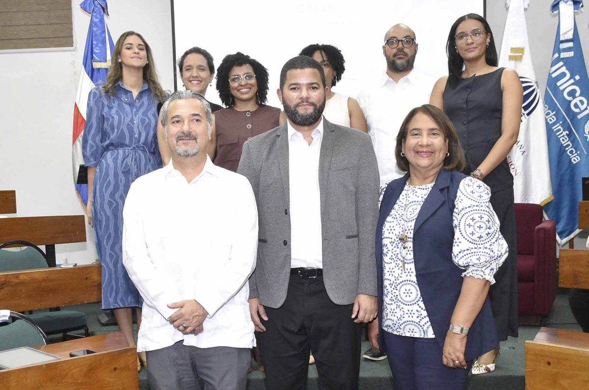 En el centro, el director general de Desarrollo Económico y Social del Ministerio de Economía, Nelson Chávez; el representante residente de UNICEF en el país, Carlos Carrera, y la directora de la Escuela de Economía de la UCSD, Oliva Luna, junto a la encargada de Monitoreo del Desarrollo Infantil del INAIPI, María Elena Valdez; la directora del Laboratorio de Neurocognición y Psicofisiología de UNIBE, Laura Sánchez; la directora de Inteligencia de Datos del Ministerio de la Presidencia, Mabely Díaz Soriano; la encargada de la División de Monitoreo de DGDES, Miriam Peralta; el oficial de Evaluación de UNICEF, Felipe Díaz, y la encargada de Evaluación de DGDES, Mery Santana.