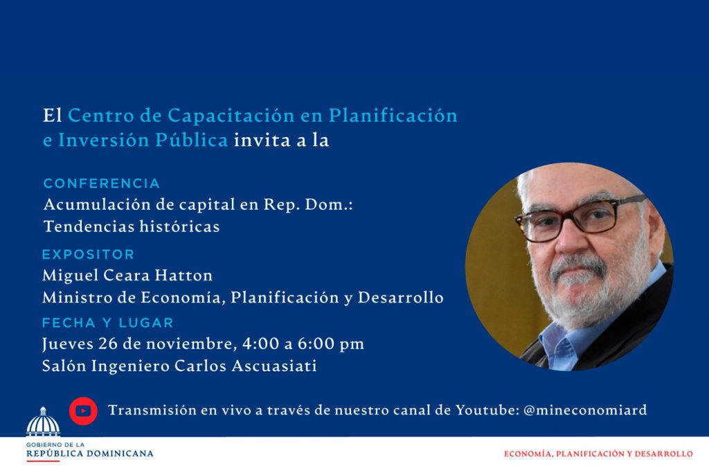 Santo Domingo, República Dominicana. (Noviembre de 2020). El ministro de Economía, Planificación y Desarrollo, Miguel Ceara Hatton, dictará el próximo jueves 26, a las 4:00 de la tarde, la teleconferencia magistral “Acumulación de capital en República Dominicana: Tendencias históricas”.
