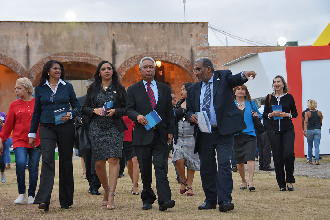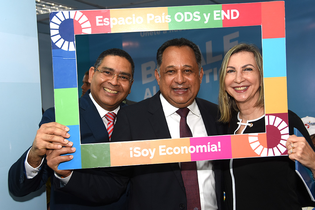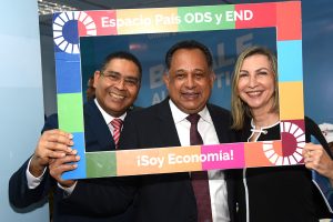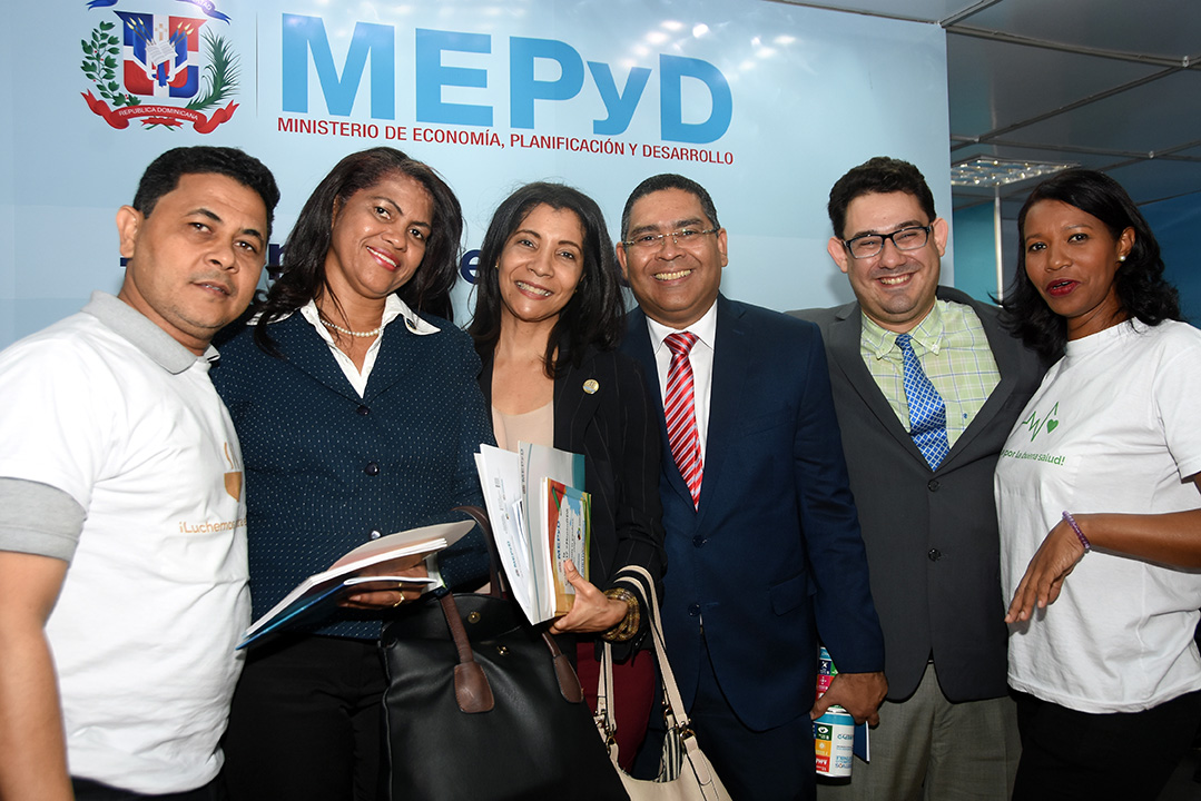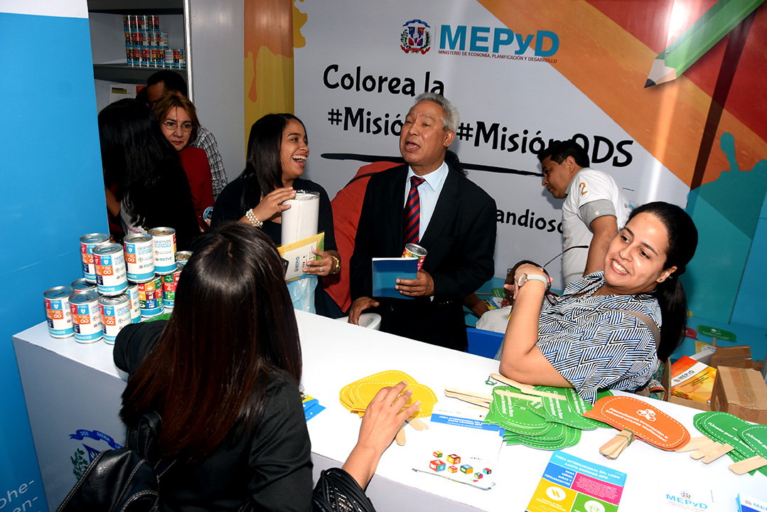 El funcionario acudió al módulo, donde el Ministerio de Economía cuenta con un “Espacio País” para promover los Objetivos de Desarrollo Sostenible (ODS) y la Estrategia Nacional de Desarrollo (END), acompañado de funcionarios y servidores de la institución.