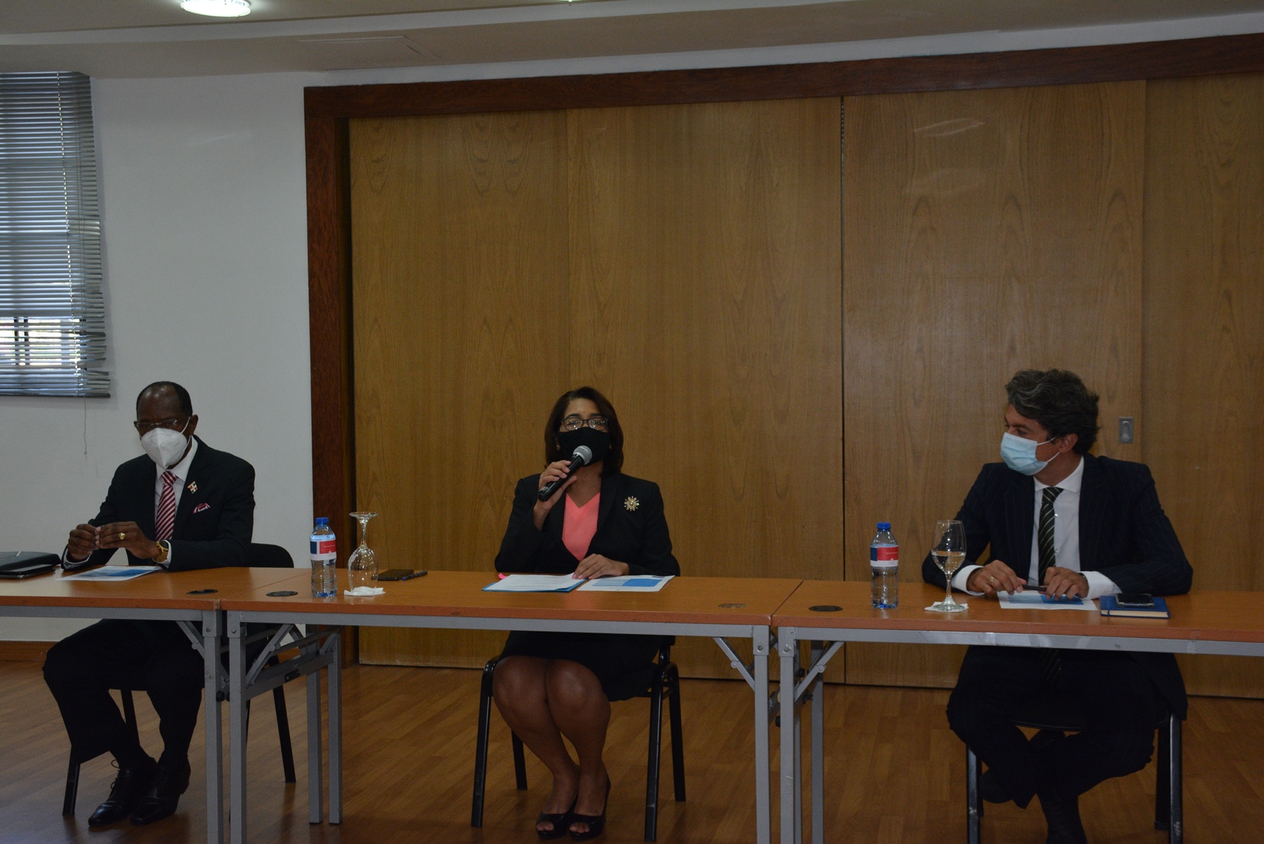La viceministra de Cooperación Internacional, Olaya Dotel, encabeza la mesa de coordinación interinstitucional. Le acompañan el viceministro de Cooperación Internacional del Ministerio de Turismo, Carlos Pequero, y Alejandro Diz, en Representación de la Delegación de la Unión Europea en República Dominicana.