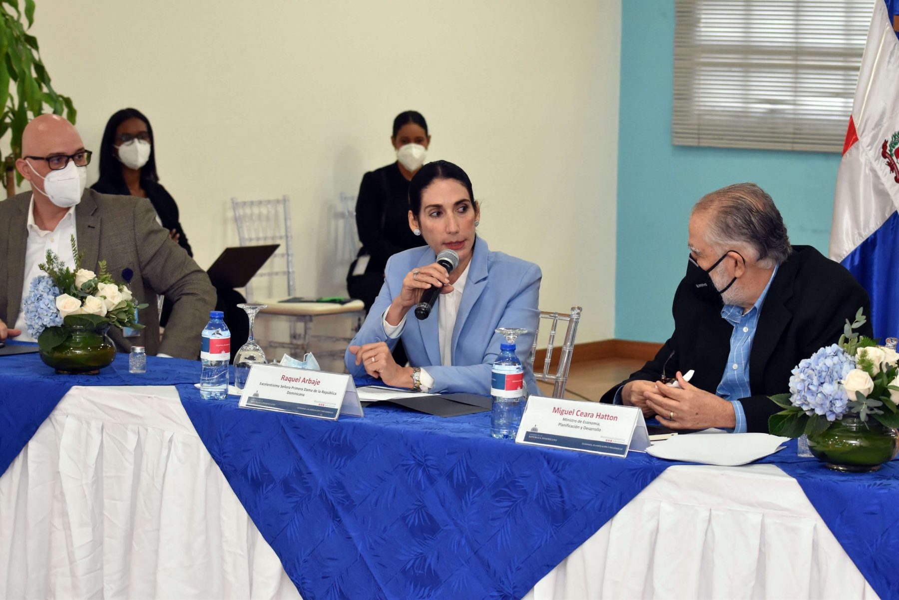 Foto oficial de Primera Dama de la República Dominicana, Raquel Arbaje, y el Ministro de Economía, Planificación y Desarrollo, Miguel Ceara Hatton, junto a viceministros, viceministas, directores y directoras del ministerio. También le acompaña la hermana de la Primera Dama, Mónica Arbaje.