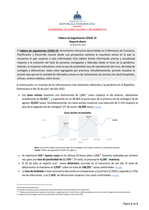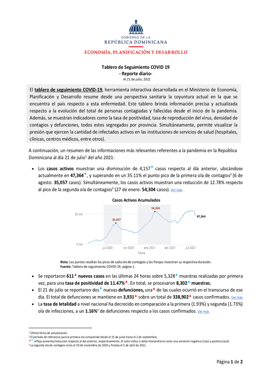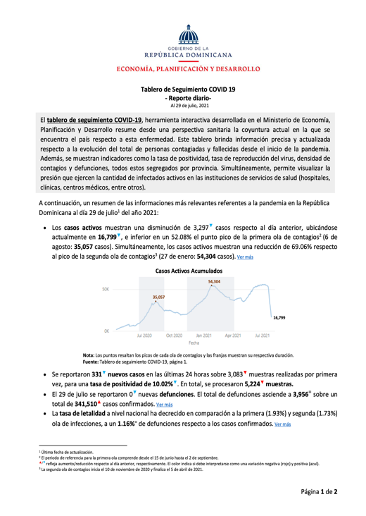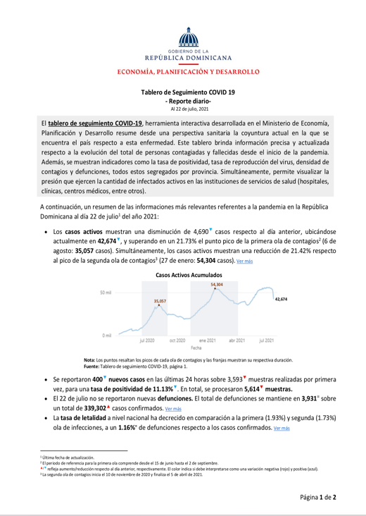 Resumen El tablero de seguimiento COVID-19, herramienta interactiva desarrollada en el Ministerio de Economía, Planificación y Desarrollo resume desde una perspectiva sanitaria la coyuntura actual en