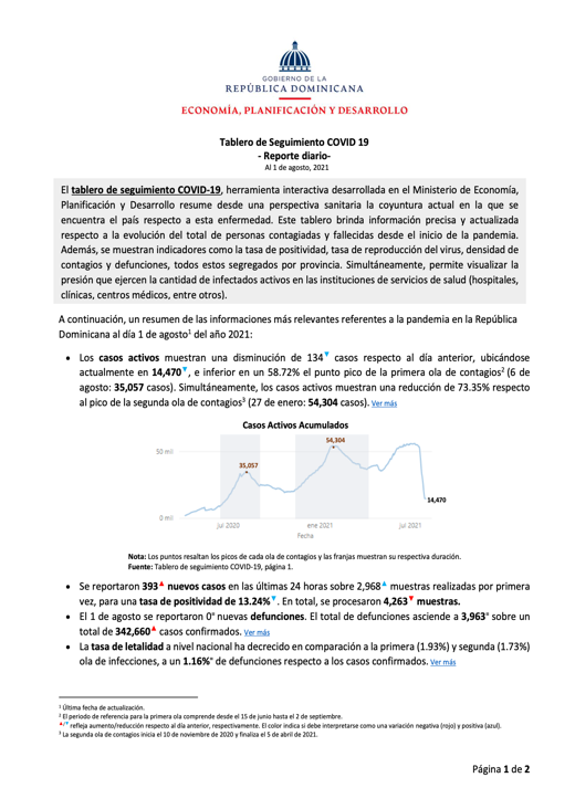 Tablero de Seguimiento COVID 19 – Reporte diario – Al 01 de agosto 2021