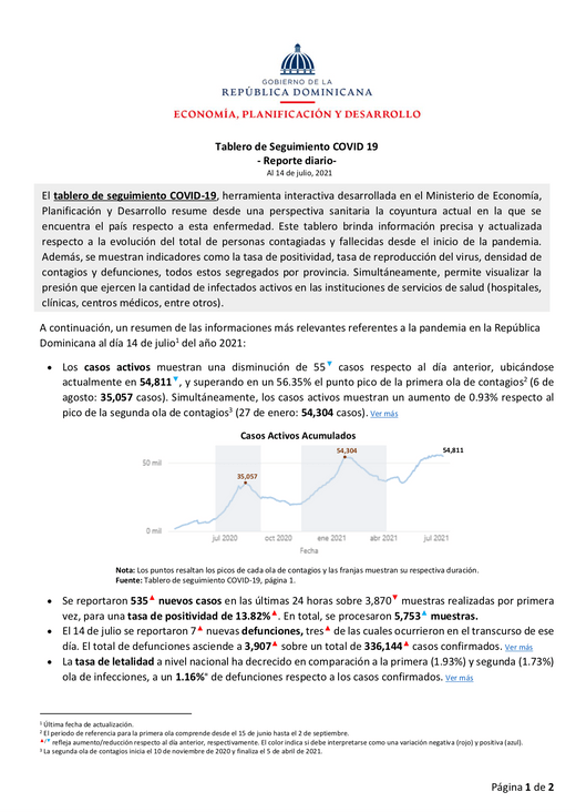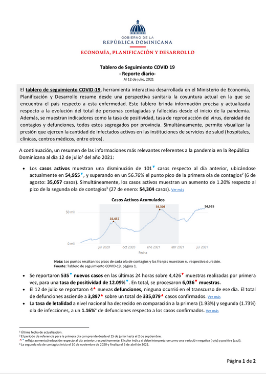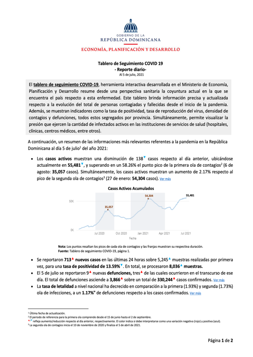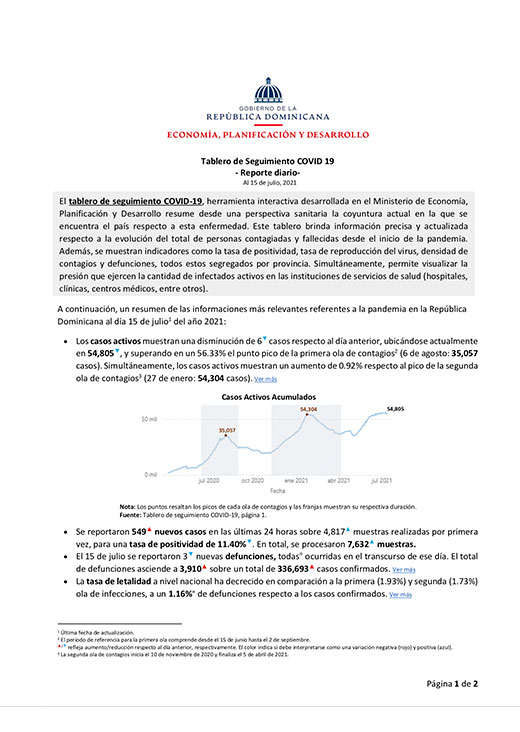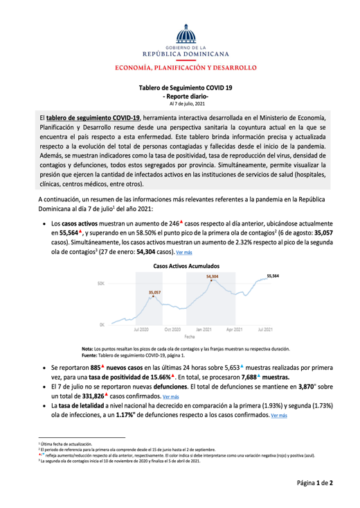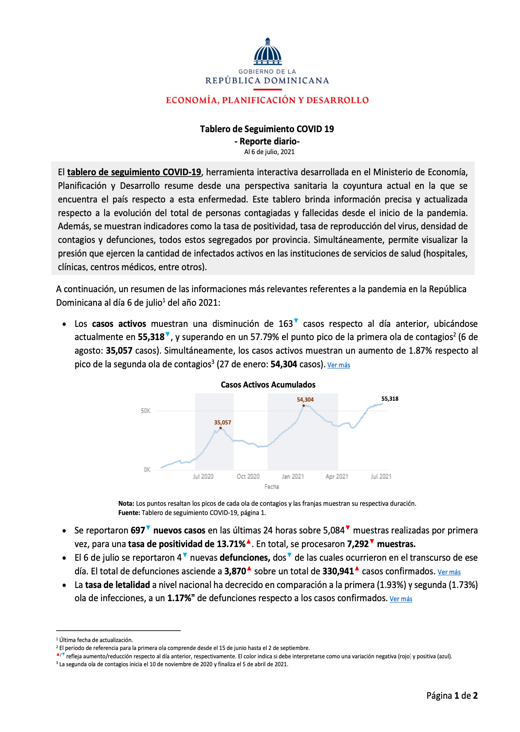 Resumen El tablero de seguimiento COVID-19, herramienta interactiva desarrollada en el Ministerio de Economía, Planificación y Desarrollo resume desde una perspectiva sanitaria la coyuntura actual en