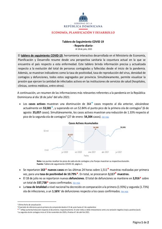 Tablero de Seguimiento COVID 19 – Reporte diario – Al 18 de julio 2021