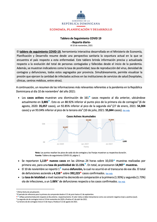 Resumen El tablero de seguimiento COVID-19, herramienta interactiva desarrollada en el Ministerio de Economía, Planificación y Desarrollo resume desde una perspectiva sanitaria la coyuntura actual en