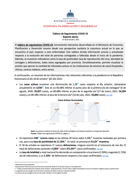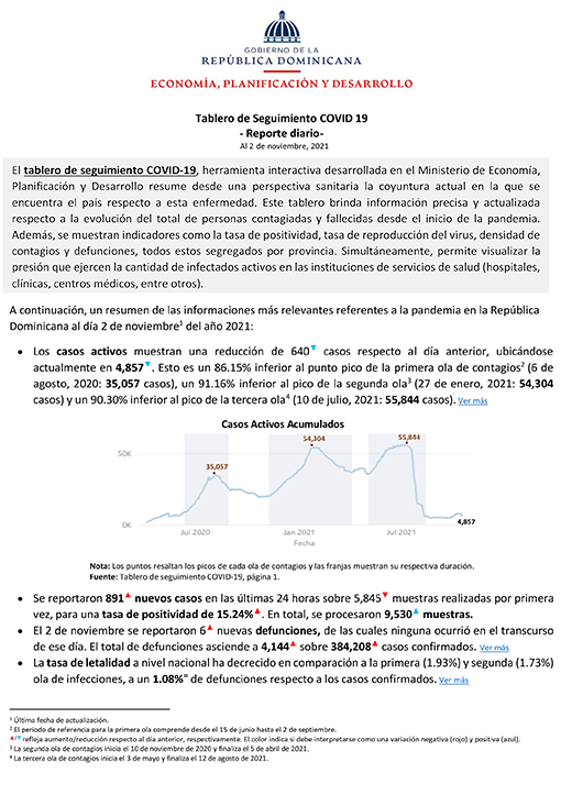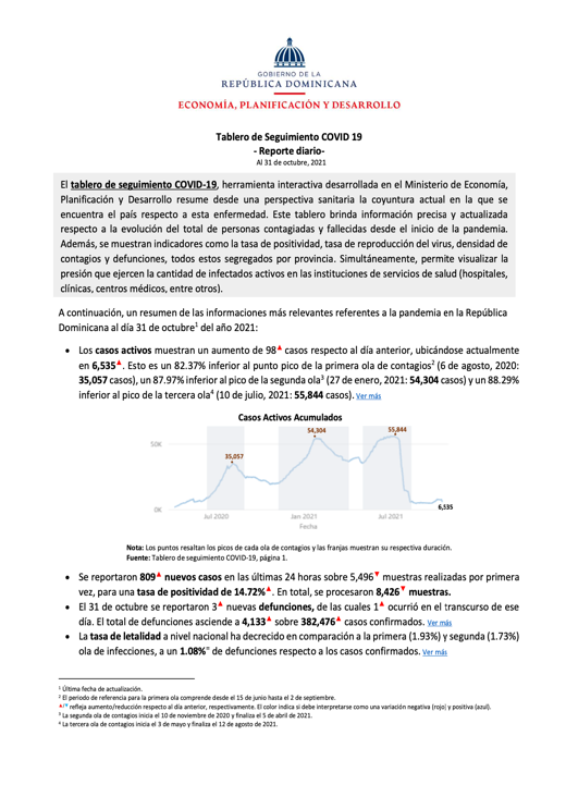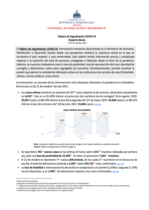Resumen El tablero de seguimiento COVID-19, herramienta interactiva desarrollada en el Ministerio de Economía, Planificación y Desarrollo resume desde una perspectiva sanitaria la coyuntura actual en
