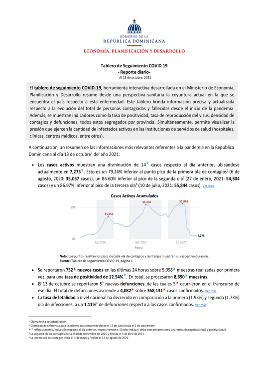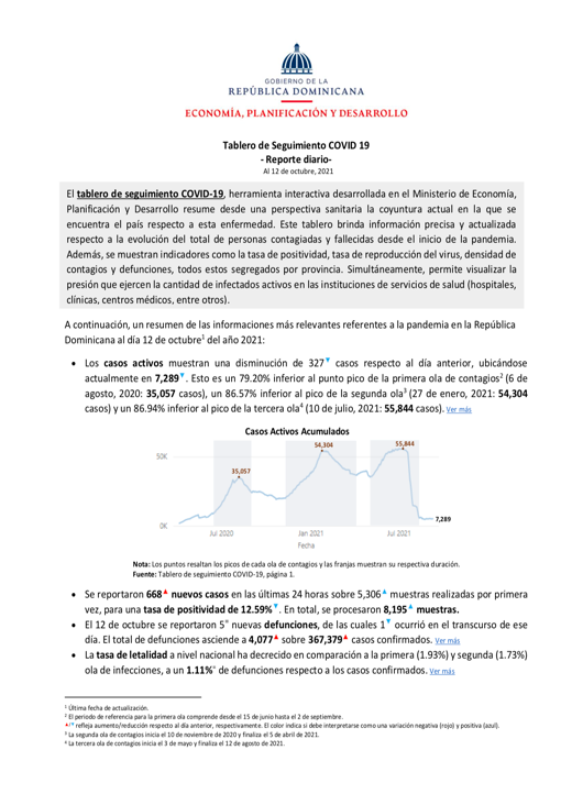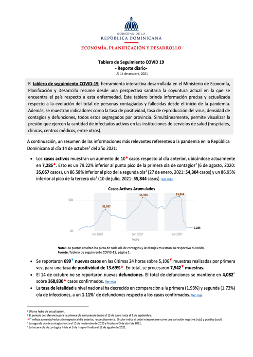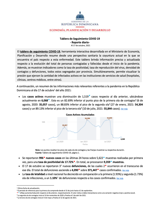 Resumen El tablero de seguimiento COVID-19, herramienta interactiva desarrollada en el Ministerio de Economía, Planificación y Desarrollo resume desde una perspectiva sanitaria la coyuntura actual en