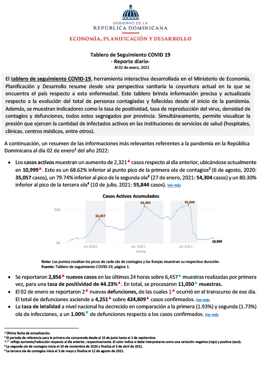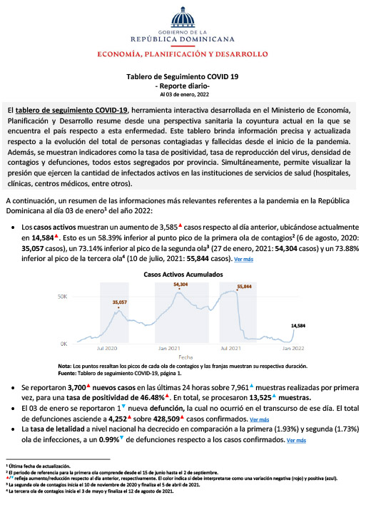 Tablero de Seguimiento COVID 19 – Reporte diario – Al 3 de enero del 2022
