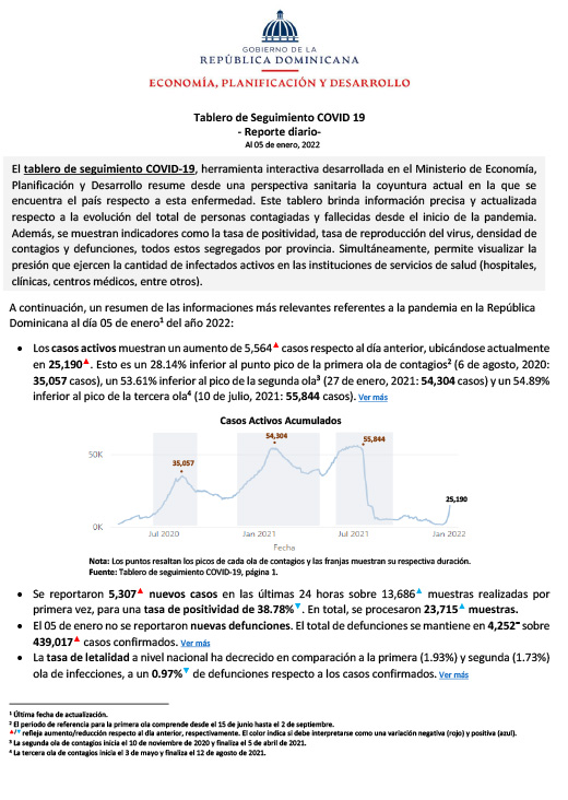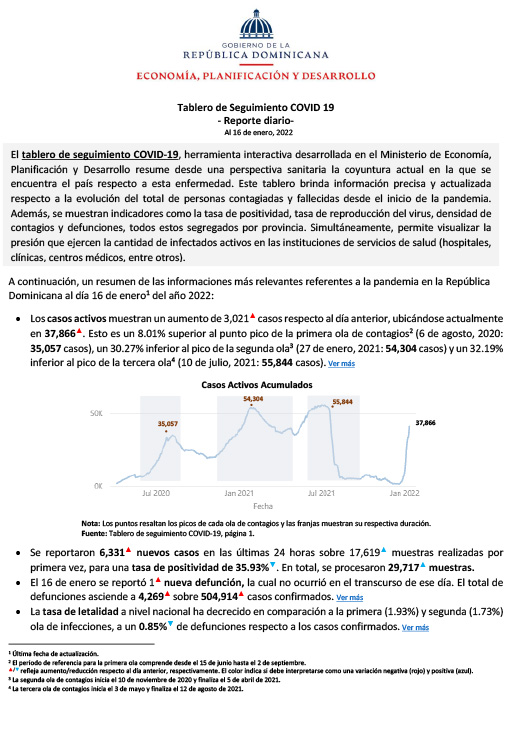 Resumen El tablero de seguimiento COVID-19, herramienta interactiva desarrollada en el Ministerio de Economía, Planificación y Desarrollo resume desde una perspectiva sanitaria la coyuntura actual en