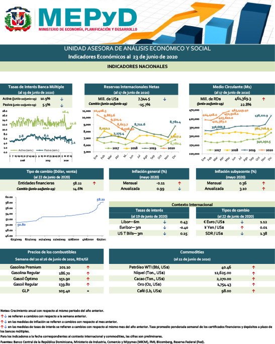 El boletín de Indicadores económicos semanales es una publicación online realizada por la Unidad Asesora de Análisis Económico y Social (UAAES) del Ministerio de Economía, Planificación y Desarrollo de la República Dominicana. Esta publicación, de periodicidad semanal, ofrece un resumen de la evolución de los principales indicadores económicos durante el periodo de referencia, proporcionando la evolución reciente de algunas de las variables de la economía más representativas del país y del entorno internacional como: tipo de cambio, reservas internacionales netas, medio circulante, tasas de interés, inflación, combustibles y commodities.