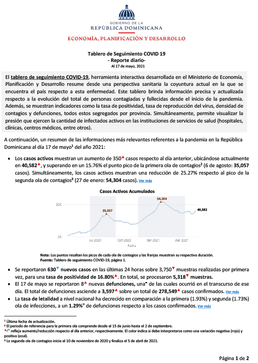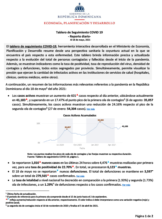 Tablero de Seguimiento COVID 19 – Reporte diario – Al 18 de mayo 2021