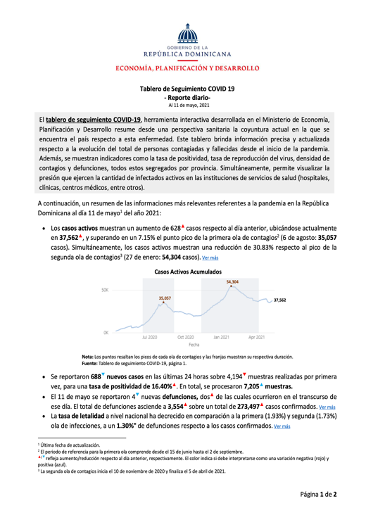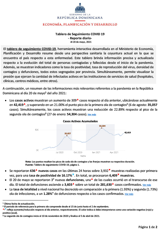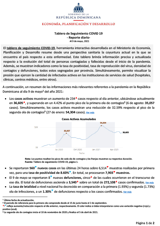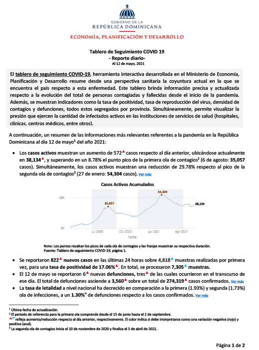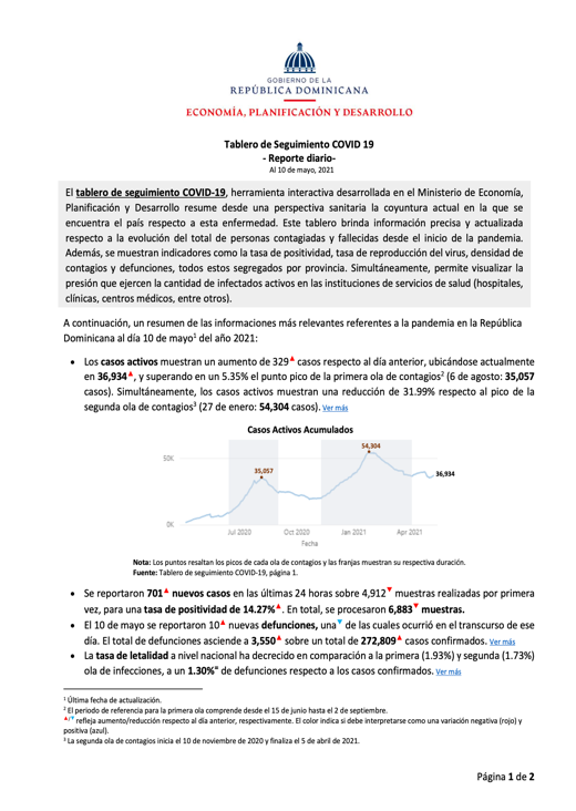 Resumen El tablero de seguimiento COVID-19, herramienta interactiva desarrollada en el Ministerio de Economía, Planificación y Desarrollo resume desde una perspectiva sanitaria la coyuntura actual en