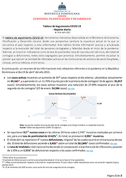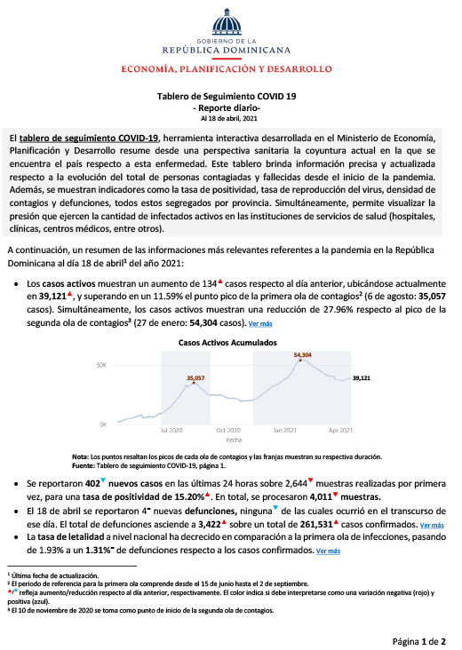 Resumen El tablero de seguimiento COVID-19, herramienta interactiva desarrollada en el Ministerio de Economía, Planificación y Desarrollo resume desde una perspectiva sanitaria la coyuntura actual en