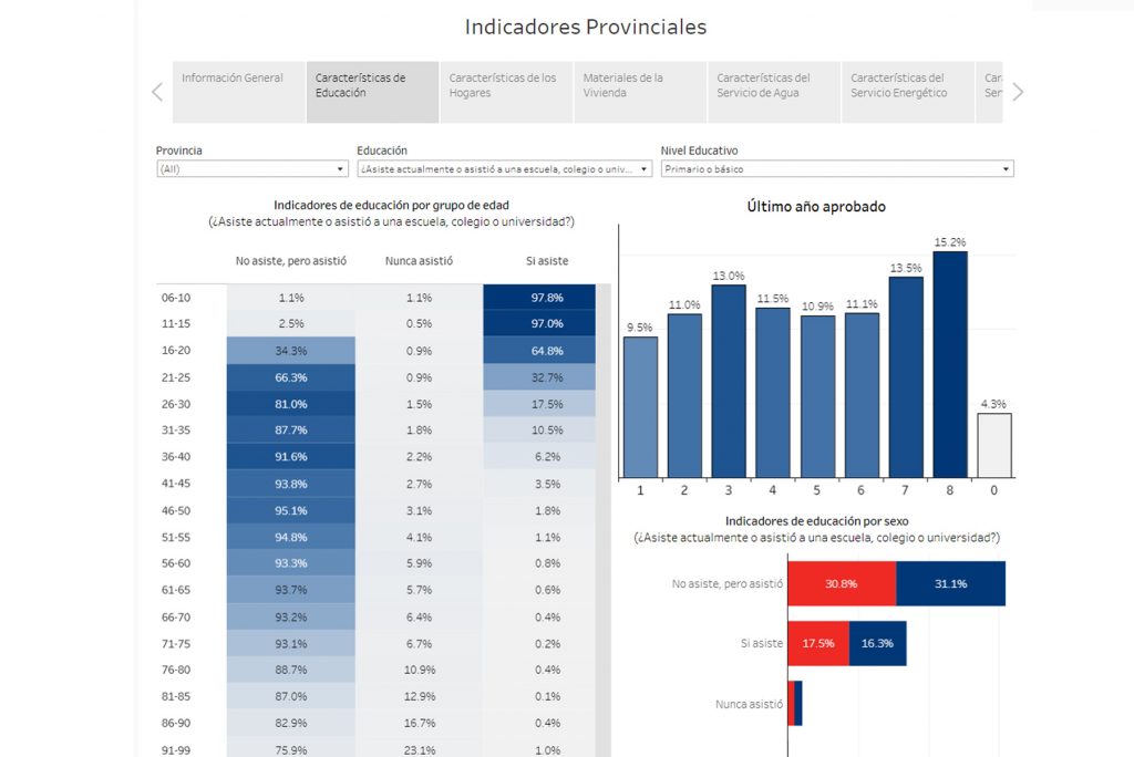 En la pestaña dos, “Características de la educación”, contiene los principales indicadores educativos y es posible filtrar utilizando las listas desplegables en la parte superior del tablero: indicadores de educación por grupo de edad, último año aprobado e indicadores de educación por sexo.