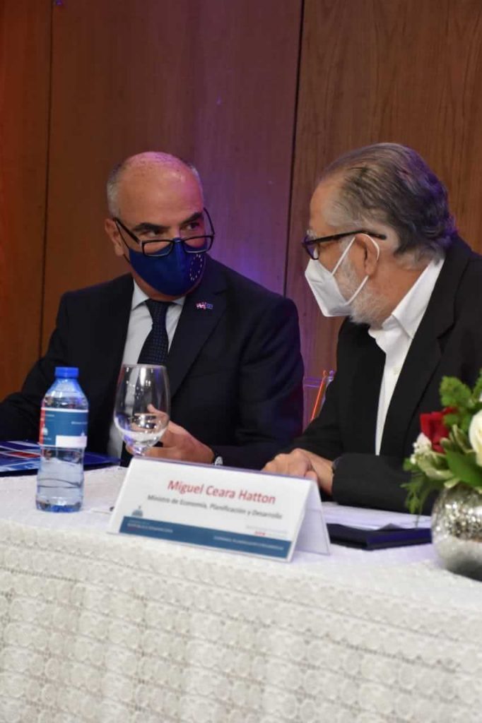 El embajador de la Unión Europea, Gianluca Grippa, conversa con el ministro de Economía, Planificación y Desarrollo, Miguel Ceara Hatton.