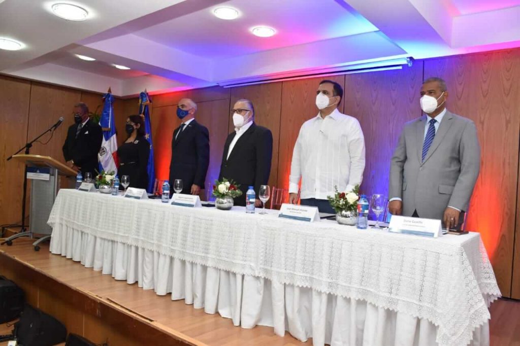 En la mesa principal, Gianluca Grippa, embajador de la Unión Europea en la República Dominicana; el ministro de Economía, Planificación y Desarrollo, Miguel Ceara Hatton; el ministro de Hacienda, José Manuel Vicente; el ministro de Administración Pública, Darío Castillo; la viceministra de Cooperación Internacional, Olaya Dotel, y el director general de Compras y Contrataciones Públicas, Carlos Pimentel.