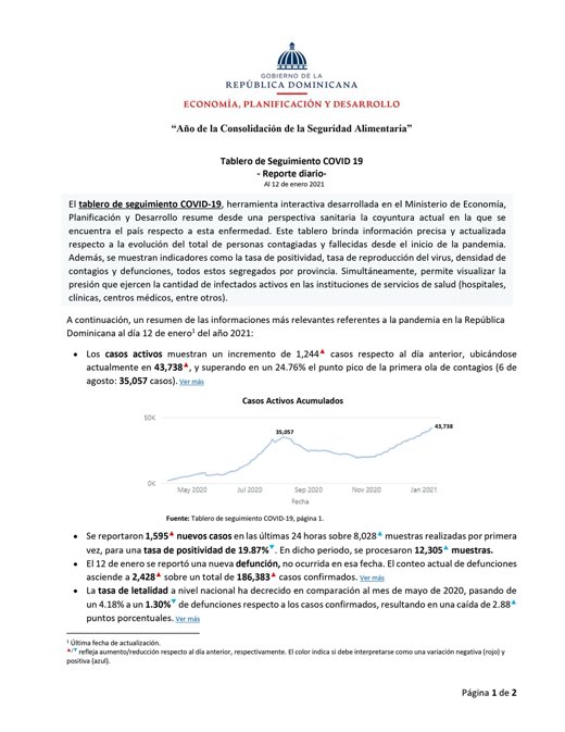 A continuación, un resumen de las informaciones más relevantes referentes a la pandemia en la República Dominicana al día 11 de enero del año 2021: