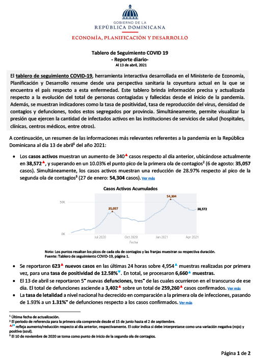 El tablero de seguimiento COVID-19, herramienta interactiva desarrollada en el Ministerio de Economía, Planificación y Desarrollo resume desde una perspectiva sanitaria la coyuntura actual en la que se encuentra el país respecto a esta enfermedad. Este tablero brinda información precisa y actualizada respecto a la evolución del total de personas contagiadas y fallecidas desde el inicio de la pandemia.