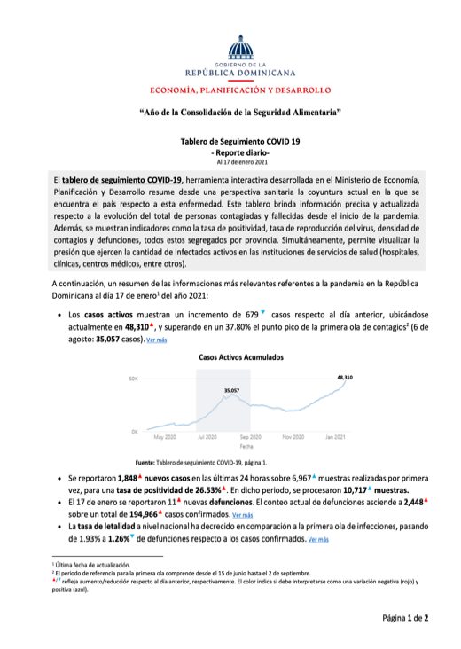 Tablero de Seguimiento COVID 19 – Reporte diario – Al 18 de enero 2021