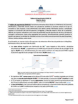 El tablero de seguimiento COVID-19, herramienta interactiva desarrollada en el Ministerio de Economía, Planificación y Desarrollo resume desde una perspectiva sanitaria la coyuntura actual en la que se encuentra el país respecto a esta enfermedad. Este tablero brinda información precisa y actualizada respecto a la evolución del total de personas contagiadas y fallecidas desde el inicio de la pandemia.