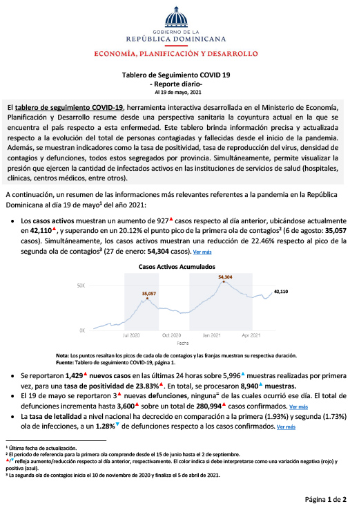 El tablero de seguimiento COVID-19, herramienta interactiva desarrollada en el Ministerio de Economía, Planificación y Desarrollo resume desde una perspectiva sanitaria la coyuntura actual en la que se encuentra el país respecto a esta enfermedad. Este tablero brinda información precisa y actualizada respecto a la evolución del total de personas contagiadas y fallecidas desde el inicio de la pandemia.
