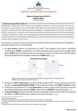 El tablero de seguimiento COVID-19, herramienta interactiva desarrollada en el Ministerio de Economía, Planificación y Desarrollo resume desde una perspectiva sanitaria la coyuntura actual en la que se encuentra el país respecto a esta enfermedad. Este tablero brinda información precisa y actualizada respecto a la evolución del total de personas contagiadas y fallecidas desde el inicio de la pandemia.