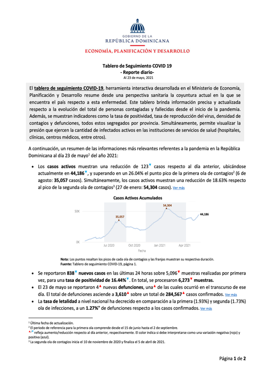El tablero de seguimiento COVID-19, herramienta interactiva desarrollada en el Ministerio de Economía, Planificación y Desarrollo resume desde una perspectiva sanitaria la coyuntura actual en la que se encuentra el país respecto a esta enfermedad. Este tablero brinda información precisa y actualizada respecto a la evolución del total de personas contagiadas y fallecidas desde el inicio de la pandemia.