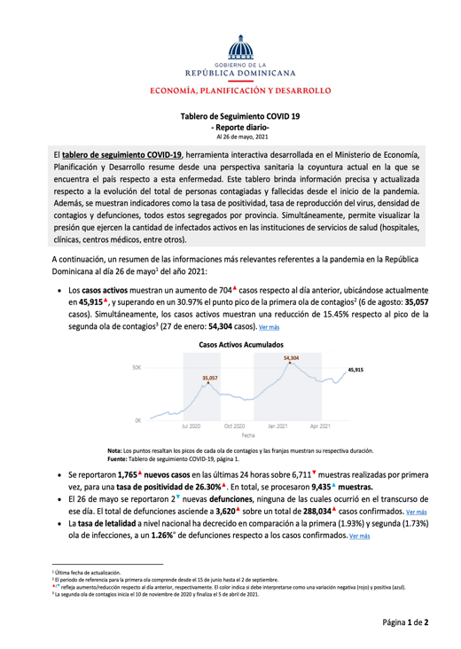 El tablero de seguimiento COVID-19, herramienta interactiva desarrollada en el Ministerio de Economía, Planificación y Desarrollo resume desde una perspectiva sanitaria la coyuntura actual en la que se encuentra el país respecto a esta enfermedad. Este tablero brinda información precisa y actualizada respecto a la evolución del total de personas contagiadas y fallecidas desde el inicio de la pandemia.