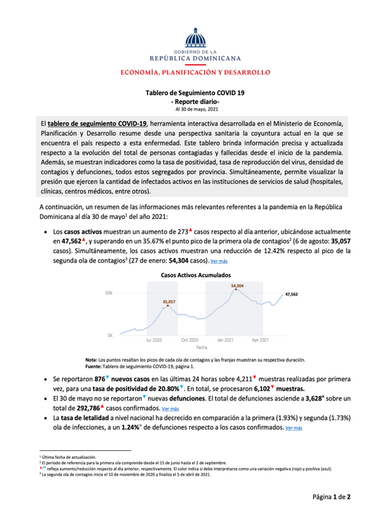 Tablero de Seguimiento COVID 19 – Reporte diario – Al 30 de mayo 2021