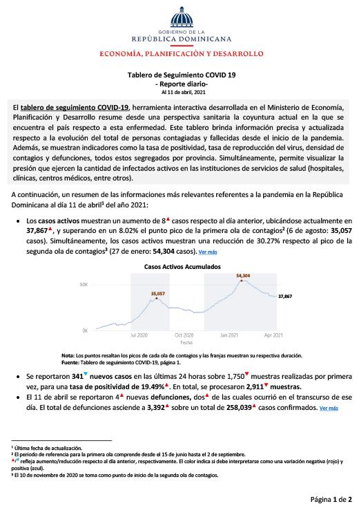 El tablero de seguimiento COVID-19, herramienta interactiva desarrollada en el Ministerio de Economía, Planificación y Desarrollo resume desde una perspectiva sanitaria la coyuntura actual en la que se encuentra el país respecto a esta enfermedad. Este tablero brinda información precisa y actualizada respecto a la evolución del total de personas contagiadas y fallecidas desde el inicio de la pandemia.