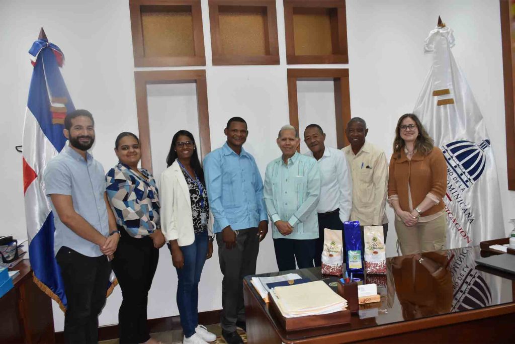 Al centro, Domingo Matías, viceministro de Ordenamiento Territorial y Desarrollo Regional del Ministerio de Economía, Planificación y Desarrollo, y Modesto Lara Encarnación el alcalde del municipio Los Cacaos, le acompañan, de izquierda a derecha, Luis de León, analista Territorial; Jennifer Álvarez, técnica de Planificación;Ingrid Francisco, analista Territorial; José Joaquín Amador, presidentede la Asociación de Caficultores La Esperanza; Rufino Herrera, miembrode la Asociación de Caficultores La Esperanza, y Erika Oviedo Amor, encargada de Ordenamiento Territorial Regional.